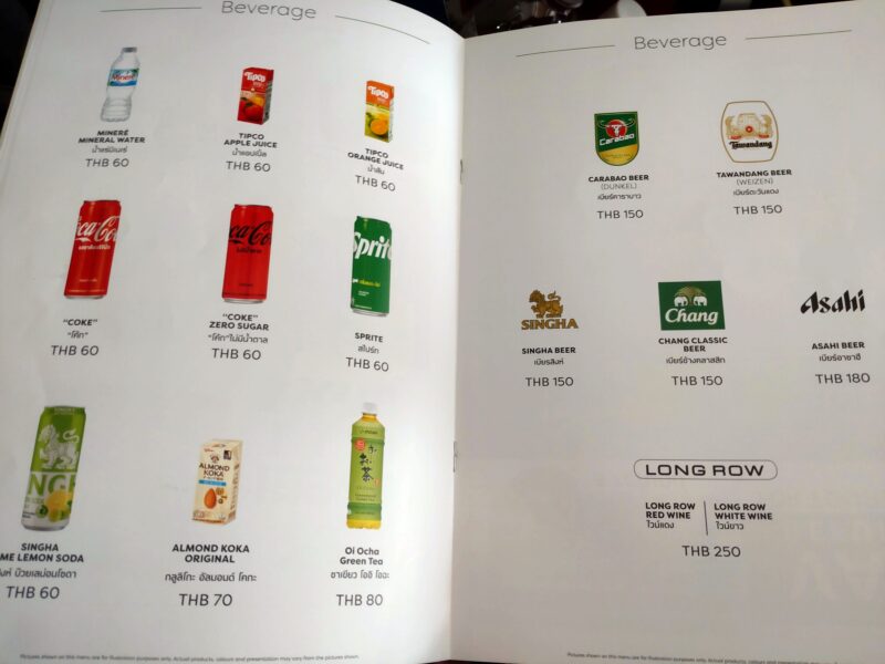 ソフトドリンクが60バーツで、ビールは150バーツ~になってます。